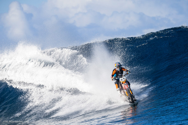 Occasionally people do stuff that immediately blows you away. Other times it takes a while to sink in, which is what I experienced when I saw the video footage titled “A daredevil in Tahiti”. At first when I saw the headline grabbing picture, I thought that it was a guy (no woman would be this crazy) on his bike which was somehow attached to a surf board. But upon watching the video my jaw dropped to the desk…. Just amazing what people who allow themselves to dream, or think outside of the box, can achieve. So cool, I was cheering him all the way down the pipe!